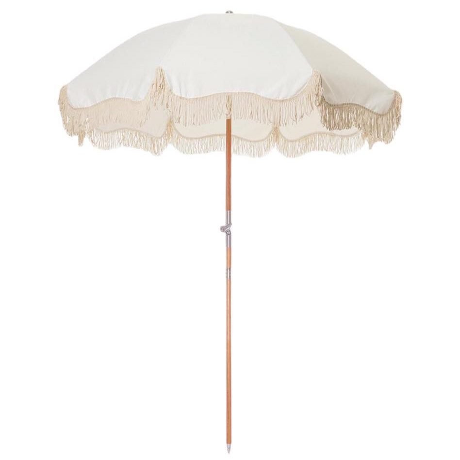 Huurprijs is inclusief witte parasolvoet, parasol is knikbaar.